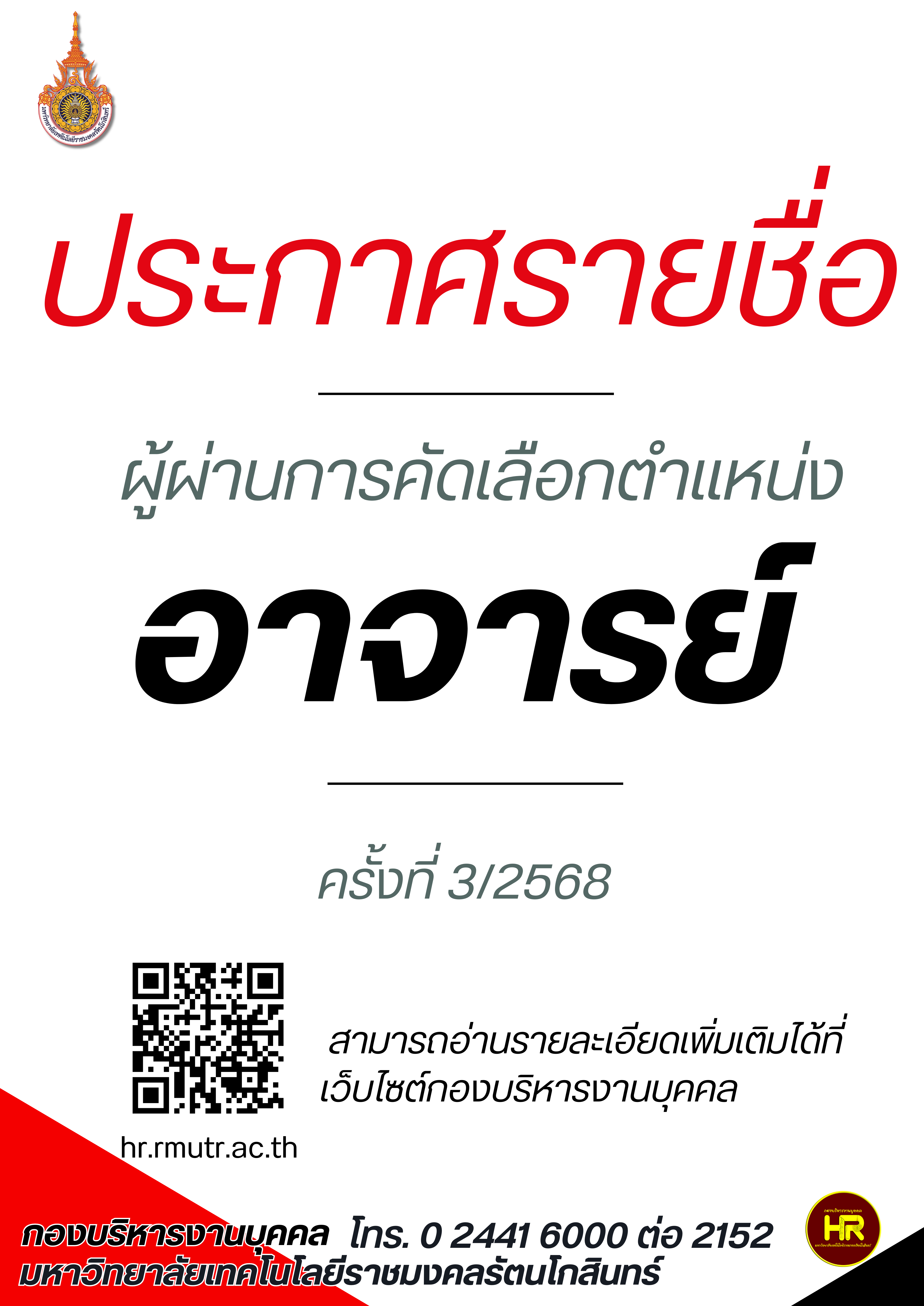 ประกาศมหาวิทยาลัยเทคโนโลยีราชมงคลรัตนโกสินทร์ เรื่อง รายชื่อผู้มีสิทธิเข้าสอบแข่งขัน และกำหนดวันเวลา สถานที่ในการสอบ เพื่อจัดจ้างเป็นพนักงานมหาวิทยาลัยสายสนับสนุน ครั้งที่ 2/2568