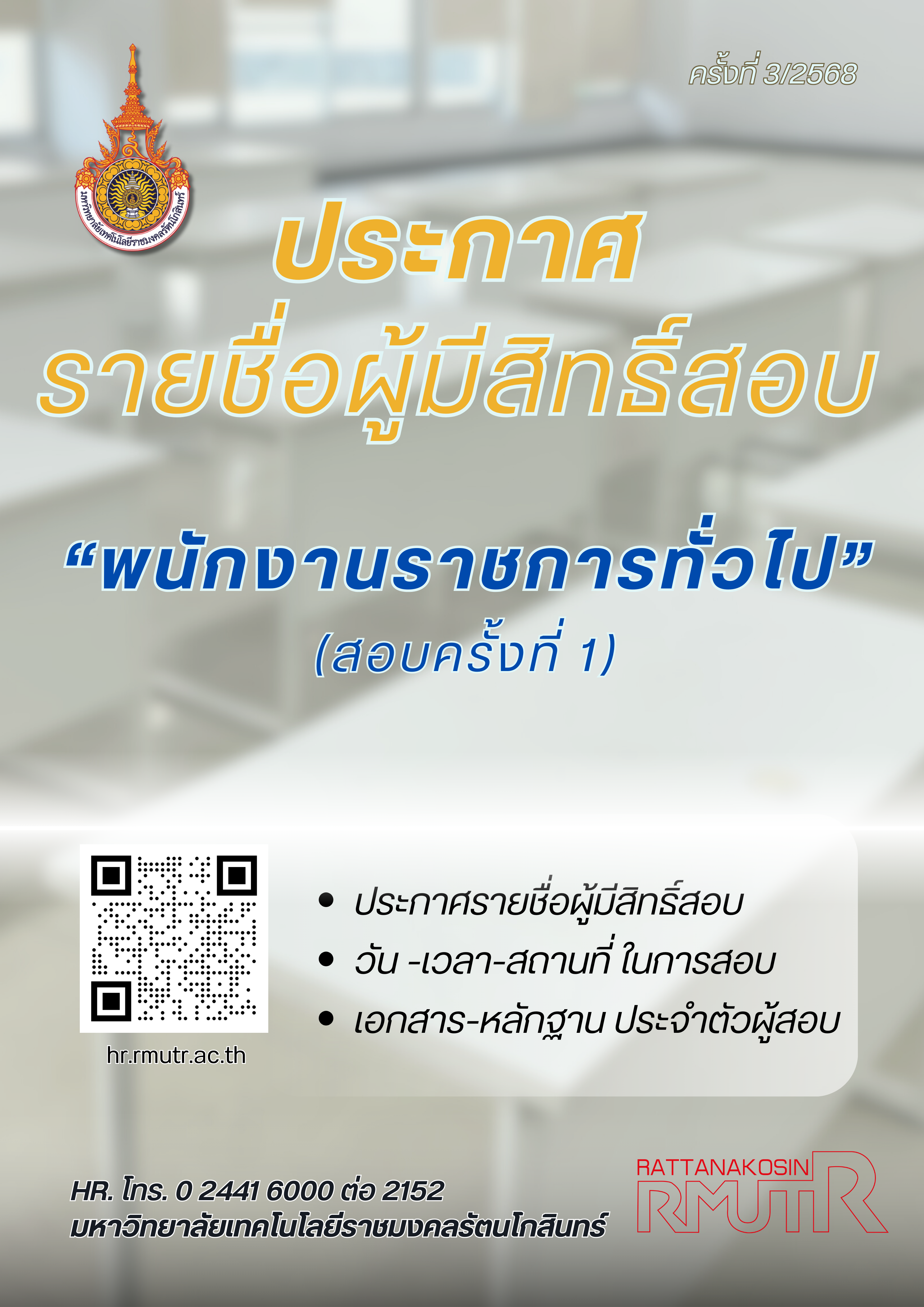 ประกาศมหาวิทยาลัยเทคโนโลยีราชมงคลรัตนโกสินทร์ เรื่อง ประกาศรายชื่อผู้มีสิทธิเข้ารับการประเมินความรู้ความสามารถ ทักษะ และสมรรถนะ ครั้งที่ 1 ตำแหน่งพนักงานราชการทั่วไป ครั้งที่ 3/2568 พร้อมกำหนดการ วัน-เวลา และสถานที่ในการสอบ >>รายละเอียด Click<<